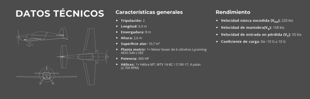 Con un motor Lycoming AEIO-540 (300 HP), una carga alar +10/-10 G y un perfil alar simétrico ofrece una precisión extrema y respuesta instantánea en sus mandos.